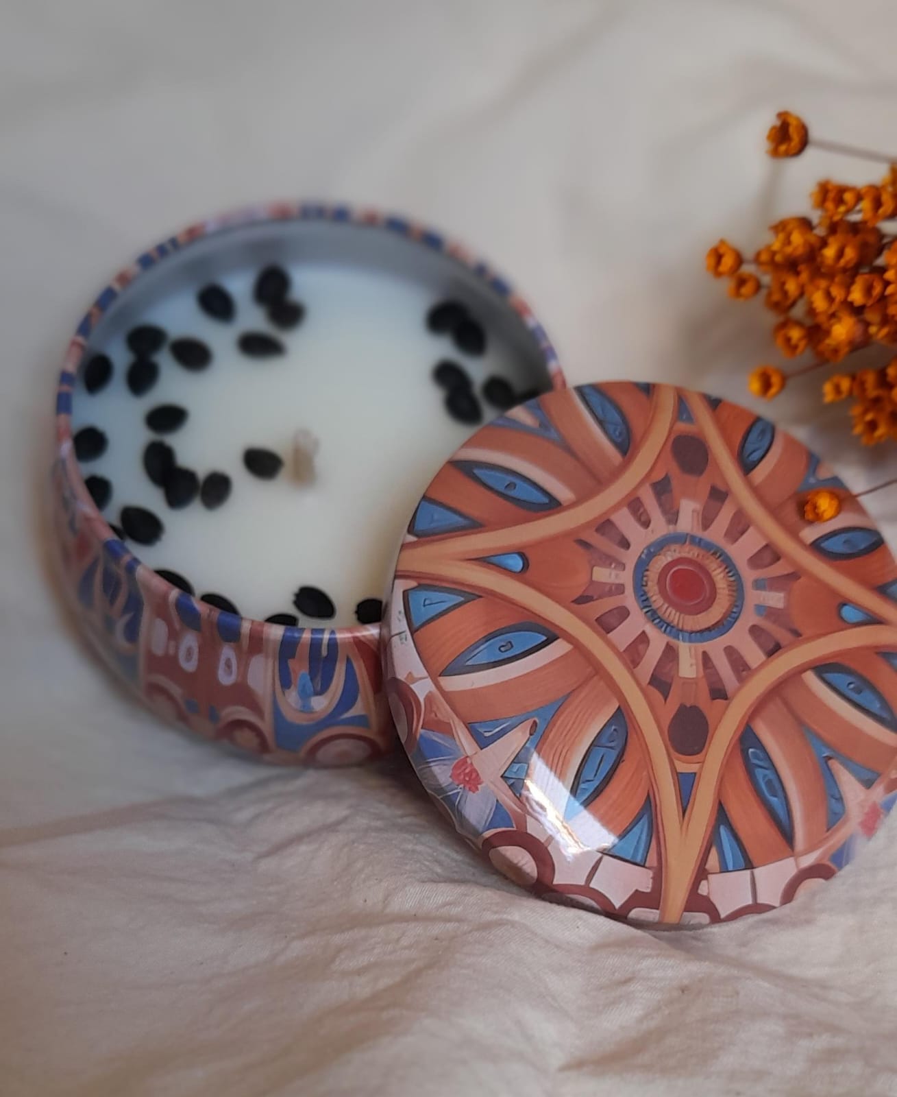 Eleve a energia do seu ambiente com a beleza e o aroma da nossa vela aromática de 100g em lata redonda, decorada com arte em mandala. Mais do que uma vela, esse item é um convite ao relaxamento, à introspecção e ao bem-estar – combinando beleza visual com uma fragrância envolvente.